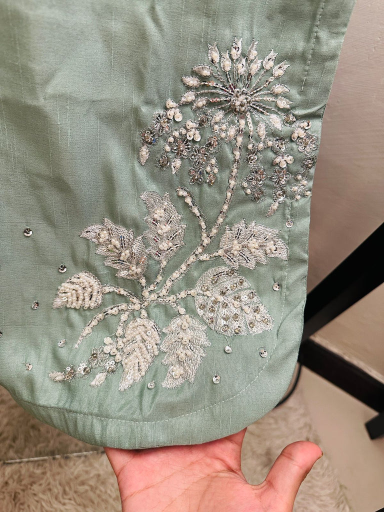 Refresh your wardrobe with our Apple Grace 3 Piece Formal Set, designed in a soothing apple green hue that radiates elegance and freshness. The outfit features intricate white floral embroidery on a soft, premium fabric, paired with a matching embroidered dupatta and plain trouser. Ideal for daytime festivities and semi-formal occasions, this graceful ensemble combines sophistication with a touch of modern charm.