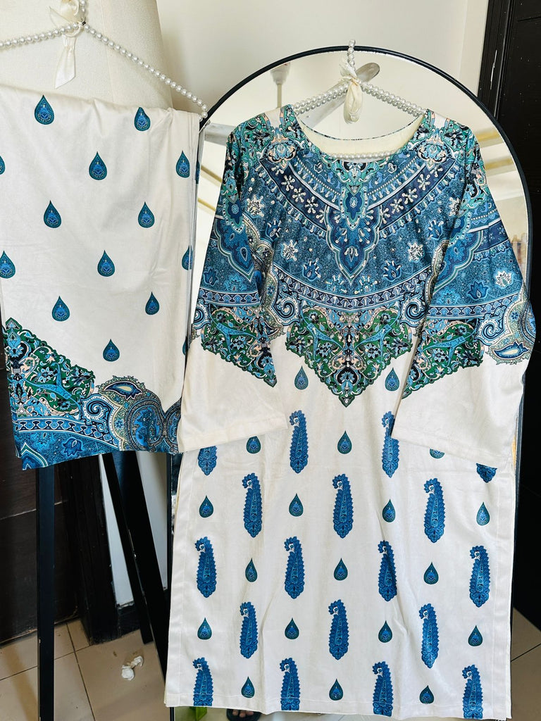 Introducing Azure Grace, a sophisticated 2-piece velvet outfit designed to make your winter style effortlessly elegant. The shirt features a stunning blend of deep blue and teal paisley motifs, beautifully arranged over a soft ivory base for a timeless, graceful look.