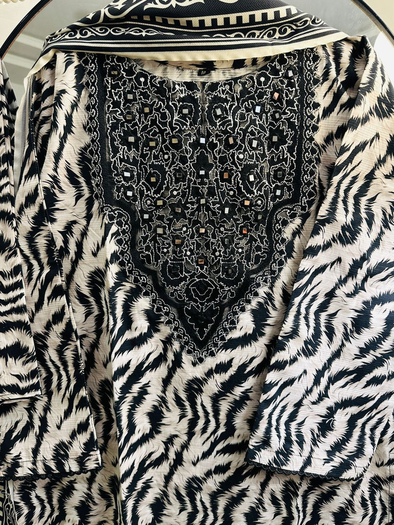 Unleash your bold elegance with this stunning black and white zebra print 3-piece suit. The outfit features an intricately embroidered neckline, classic printed borders, and a soft matching dupatta for a complete, graceful look. Crafted from premium fabric, this design beautifully blends traditional embroidery with a modern pattern — perfect for casual gatherings or elegant evening wear.