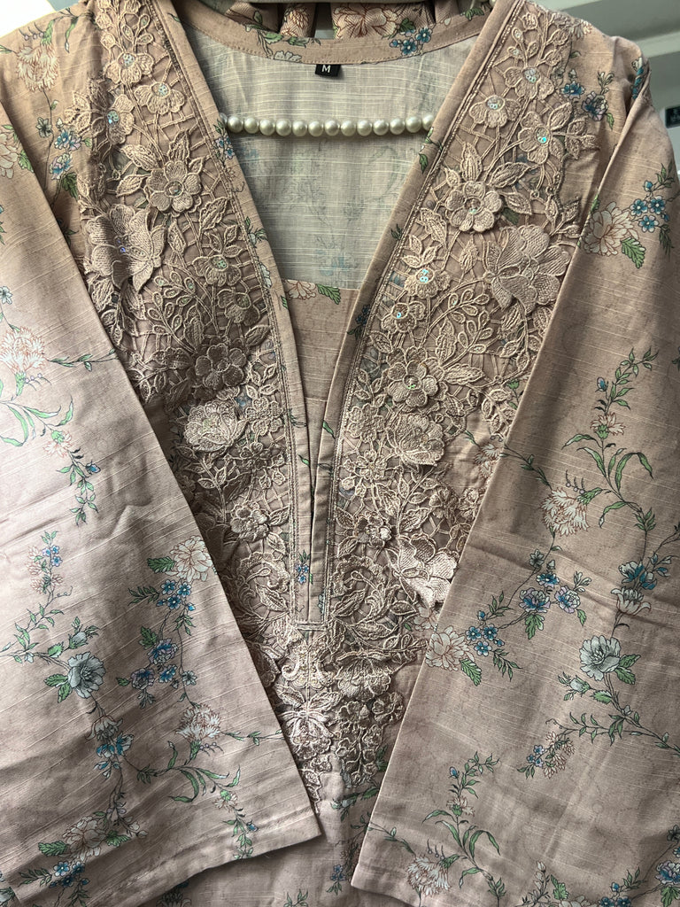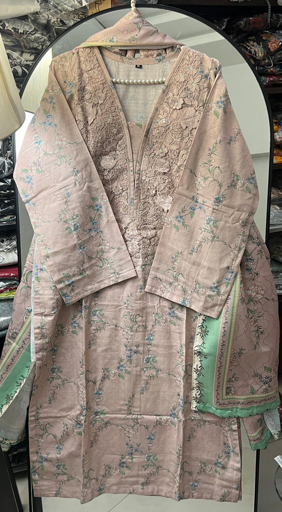 Grace your winter wardrobe with our Blush Bloom Embroidered Khaddar Set, a perfect blend of elegance and comfort. This 3-piece ensemble features a soft blush base adorned with delicate floral prints and intricate thread embroidery on the neckline. The subtle lace detailing and pastel green bordered dupatta add a refined feminine touch, making it ideal for both casual gatherings and semi-formal occasions.