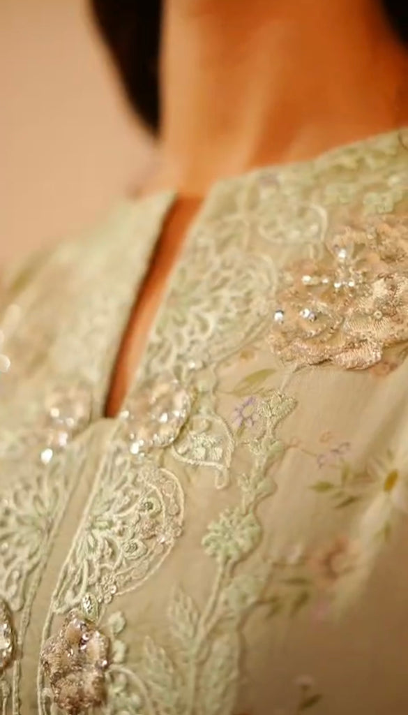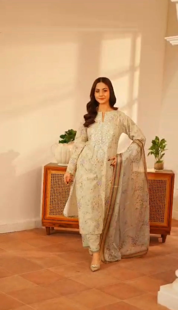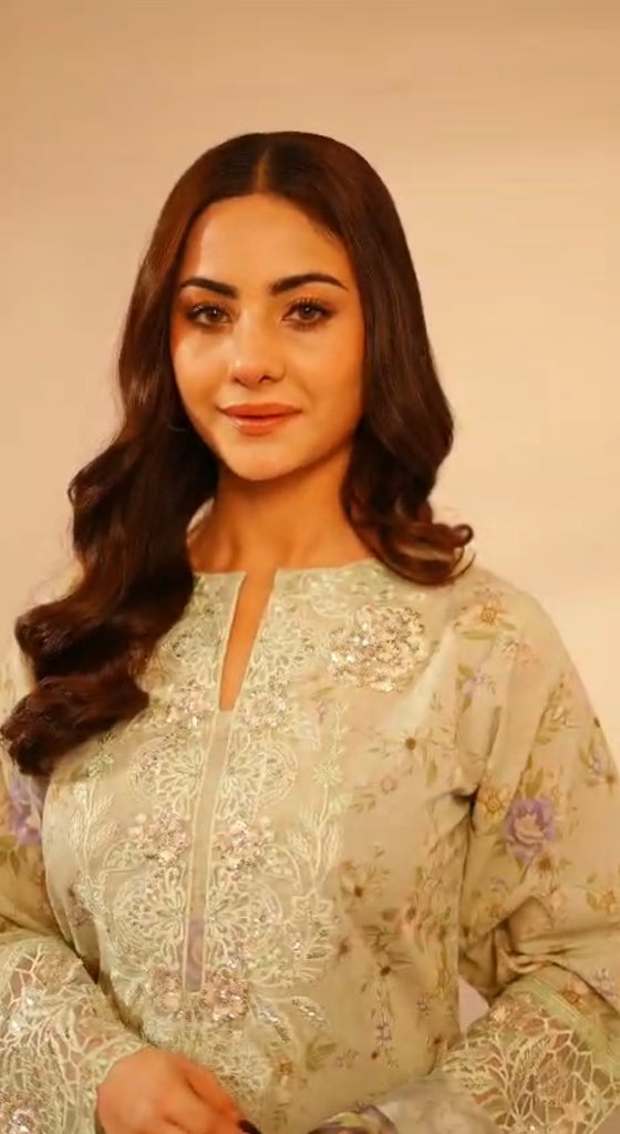 Step into timeless elegance with this beautifully crafted mint green 3-piece lawn suit, designed for a graceful and sophisticated look. The shirt features intricate all-over embroidery with delicate detailing on the neckline, sleeves, and daman, adding a refined charm to your outfit. Paired with a matching straight trouser and a softly printed dupatta with elegant borders, this ensemble is perfect for festive gatherings, formal lunches, and summer soirées.