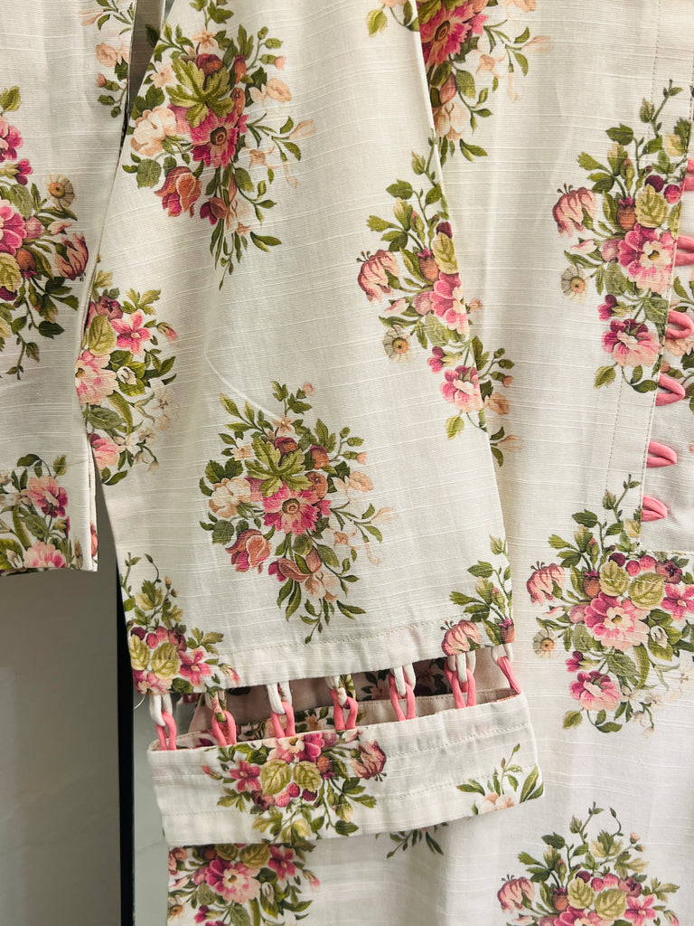 Step into timeless elegance with this beautifully designed two-piece outfit. Crafted from soft khadar, the fabric features delicate pink and green floral prints on a classic white base — perfect for a graceful and refreshing look. The intricate detailing on the neckline adds a charming touch, making it ideal for casual wear..