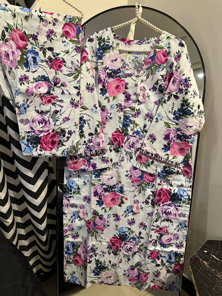 Step into timeless elegance with this beautifully designed two-piece outfit. Crafted from soft khadar, the fabric features delicate plump and pink floral prints on a classic white base — perfect for a graceful and refreshing look. The intricate detailing on the neckline adds a charming touch, making it ideal for casual wear..