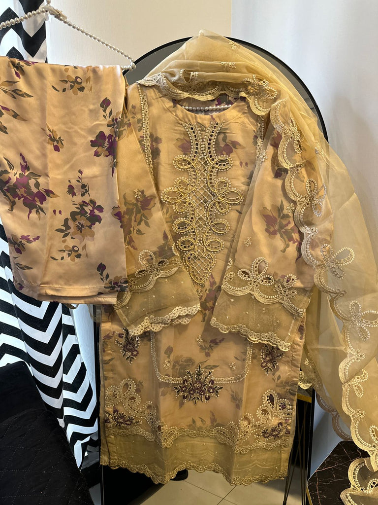 Experience timeless sophistication with this beautifully crafted 3-piece outfit in a refined Soft Sandstone Glow shade. The ensemble features a fully embroidered organza shirt, complemented by embroidered sleeves and an elegantly finished embroidered daman, giving the outfit a graceful and luxurious look.
