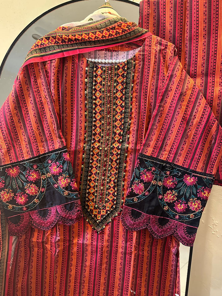 Work Technique: Dyed, Print,handmadeneck, embroidery sleeves, embroidery in daman