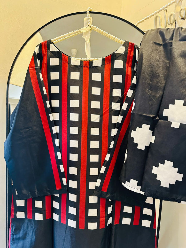 Experience the beauty of Lulusar with our long 2 piece outfit, featuring a unique dyed and printed design. The orange, seagreen, and offwhite colors blend perfectly to create an eye-catching pattern. Step out in style and make a statement with this one-of-a-kind ensemble.