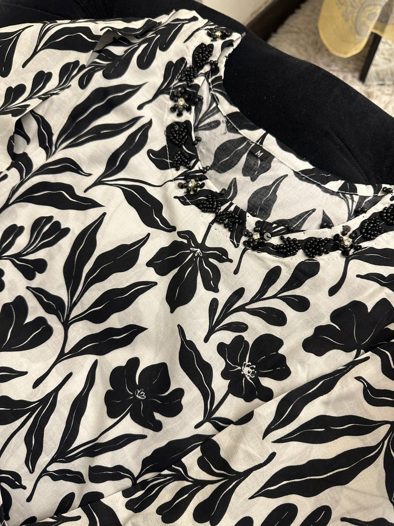 This elegant ensemble features a black and white leaf-printed lawn cotton shirt, beautifully enhanced details on the neckline, for a refined finish. Paired with a matching printed trouser, this suit is ideal for effortless day-to-day elegance.