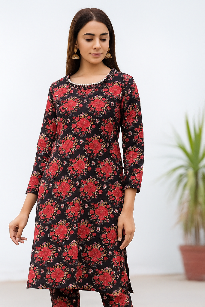 Elevate your wardrobe with our Midnight Rose Floral 2-Piece Set, featuring a timeless black base adorned with bold red rose prints. Crafted from soft, breathable fabric, this outfit combines traditional charm with modern comfort. The long shirt is beautifully tailored for an elegant silhouette, paired with matching trousers for a complete look. Perfect for casual gatherings or semi-formal occasions — radiate grace and style effortlessly with this floral masterpiece.