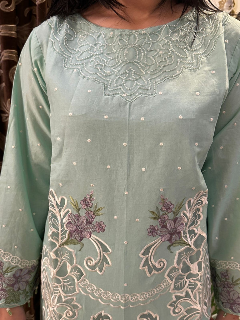 Step into elegance with our beautifully crafted Mint Green Embroidered 3-Piece Suit, designed for festive gatherings and special occasions. This outfit blends soft pastel tones with intricate white and lilac embroidery, creating a graceful and timeless look.
