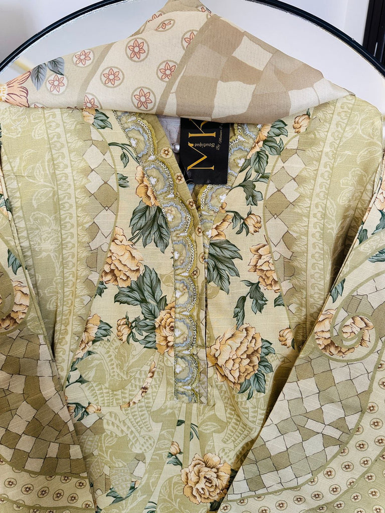 Refresh your wardrobe with this olive green 3 piece printed khadar suit from MK Boutique by Mahnoor Khizer. Designed with a stunning blend of floral and geometric prints, this outfit is perfect for both casual and semi-formal occasions.