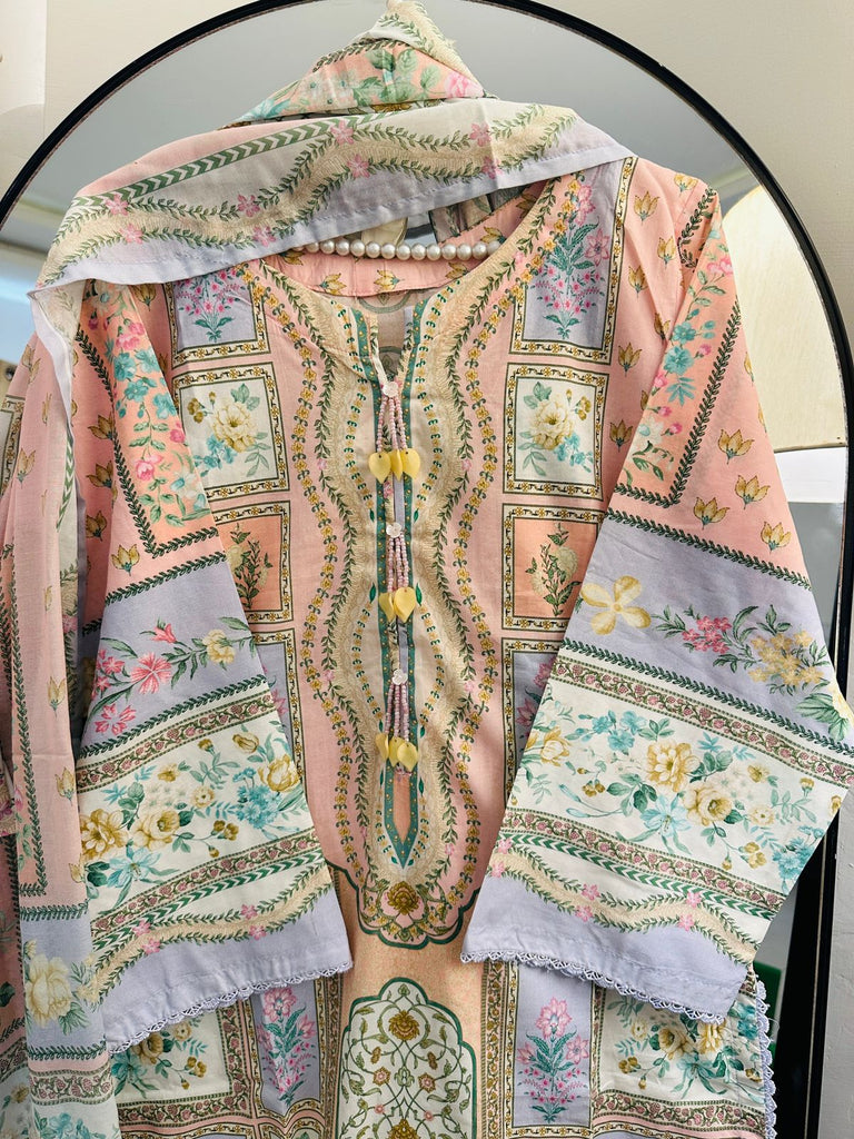 Step into soft summer elegance with this beautifully designed 3PC lawn suit in a soothing peach tone. Featuring intricate panel-style floral prints with delicate borders, this outfit blends tradition with modern charm. The neckline is gracefully detailed with printed tassel accents, while the sleeves and daman showcase coordinated floral patterns for a polished, complete look.