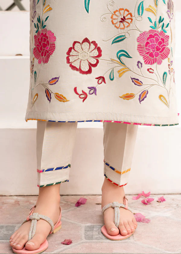 Add a vibrant touch to your wardrobe with this beautifully crafted 3-piece lawn suit, designed with colorful embroidery and elegant rainbow gota detailing.