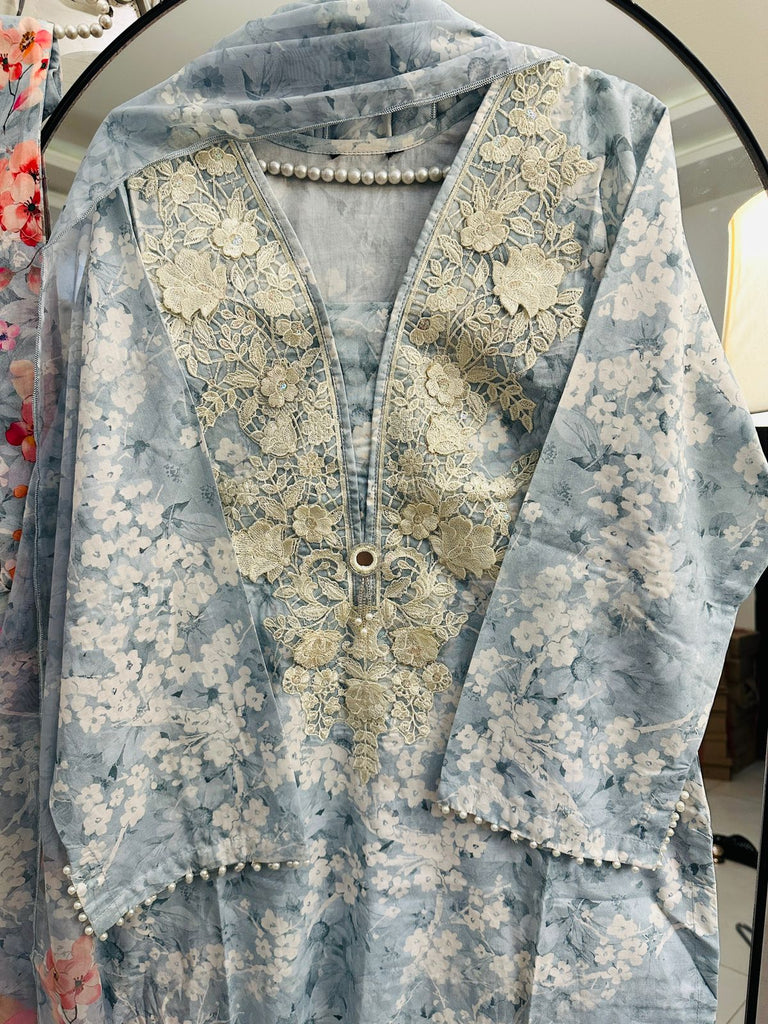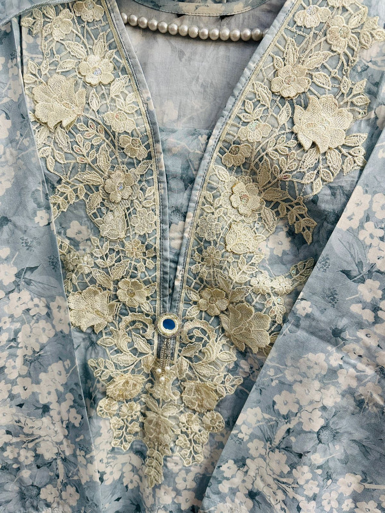 Refresh your summer wardrobe with this elegant 2-piece lawn suit featuring a soft sky-blue floral print paired with delicate craftsmanship. The shirt is beautifully enhanced with a lace embroidered neckline and finished with subtle pearl detailing on the sleeves, giving it a graceful and premium look.