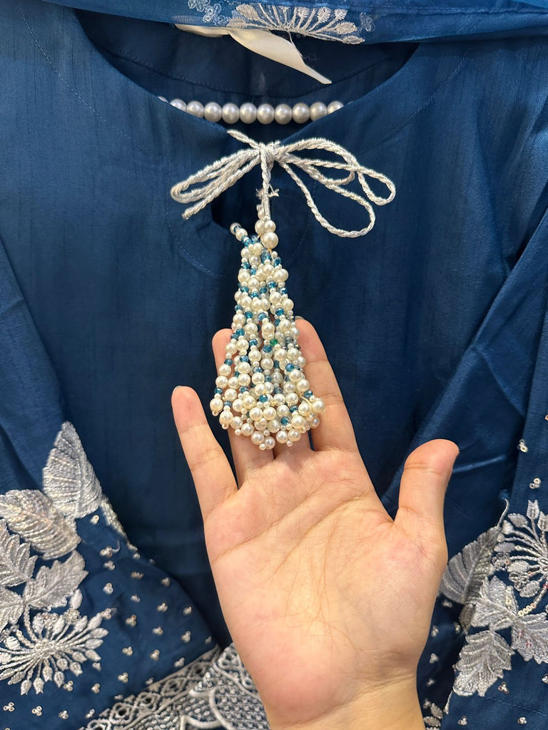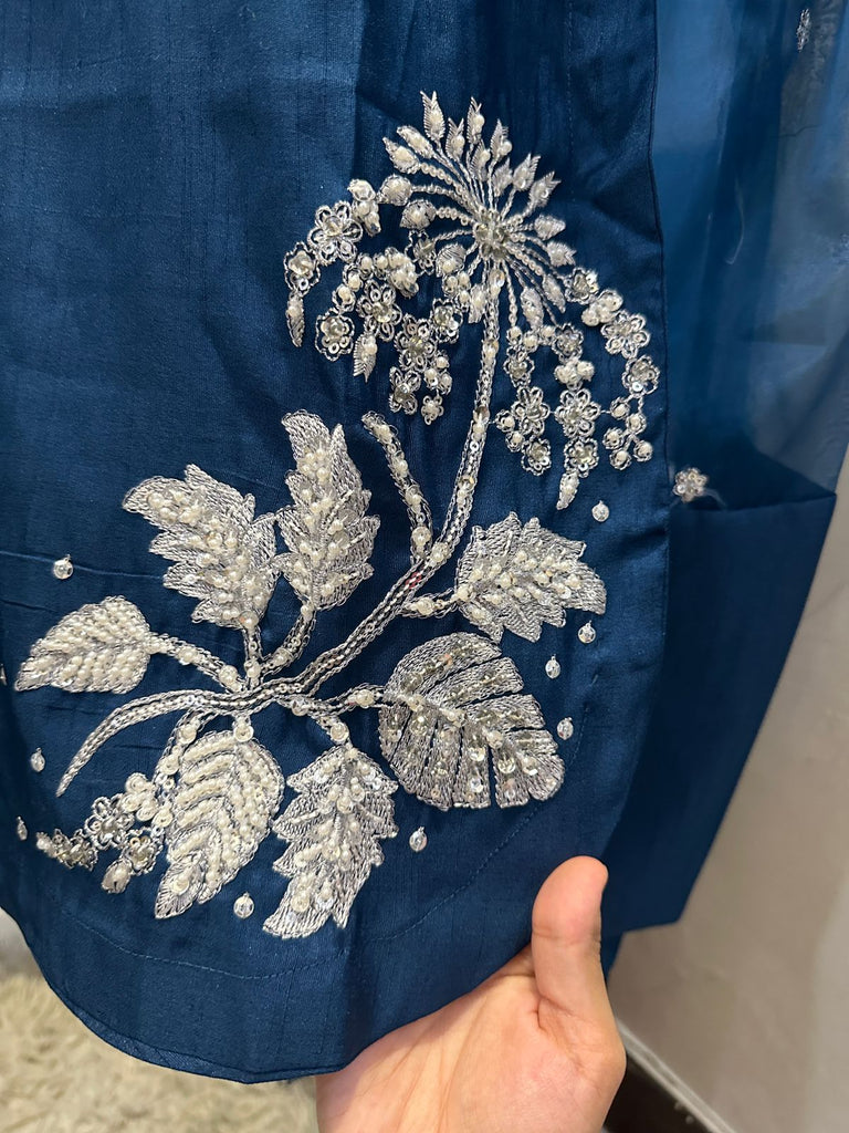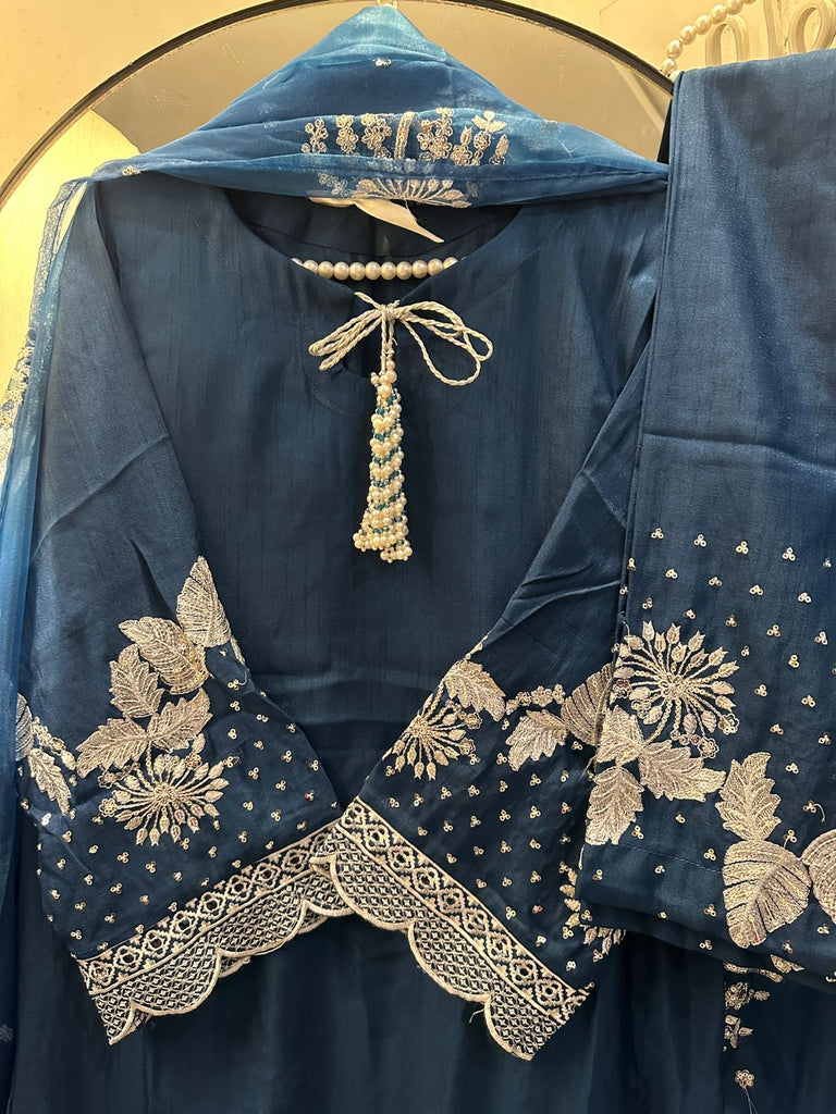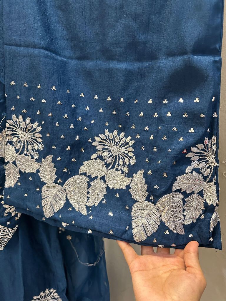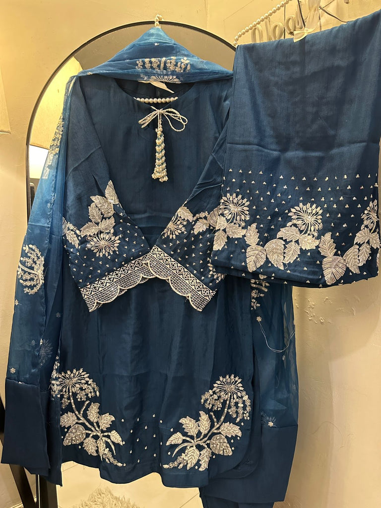Work Technique: Introducing our Solid Blue 3-piece suit for women, a timeless addition to any wardrobe. Made from premium raw silk, this set features an elegant shirt with a length of 37 inches, complemented by a trouser and organza dupatta. Perfect for both semi-formal and casual occasions..