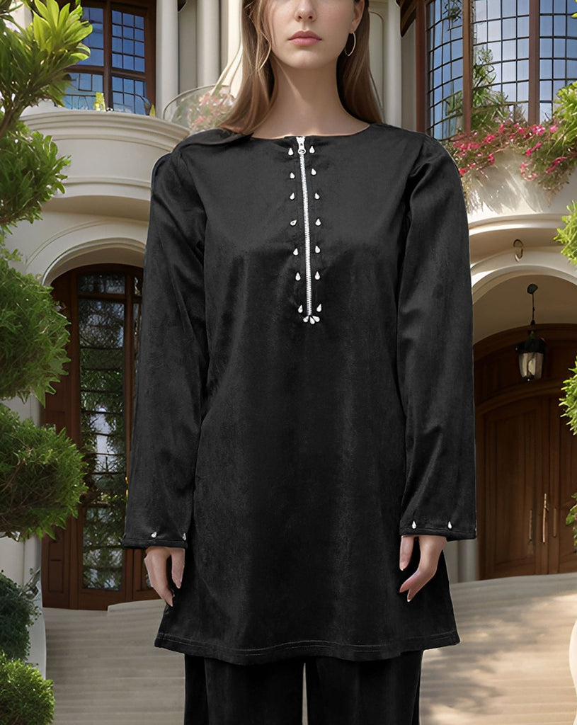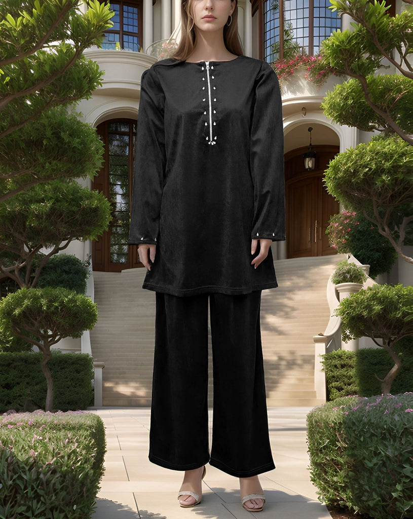 Elevate your winter wardrobe with this luxurious velvet cord set, featuring a modern zip-style neckline adorned with diamond pearls for a touch of sparkle. Available in elegant black and rich bottle green shades, this outfit blends comfort with sophistication. The soft velvet fabric offers a smooth, cozy feel—perfect for both casual and semi-formal occasions. Style it effortlessly for a refined, graceful look.